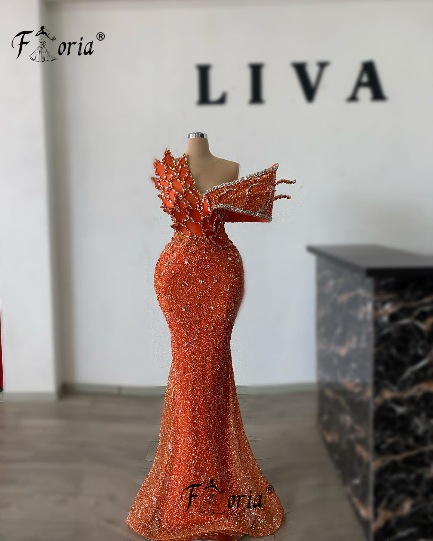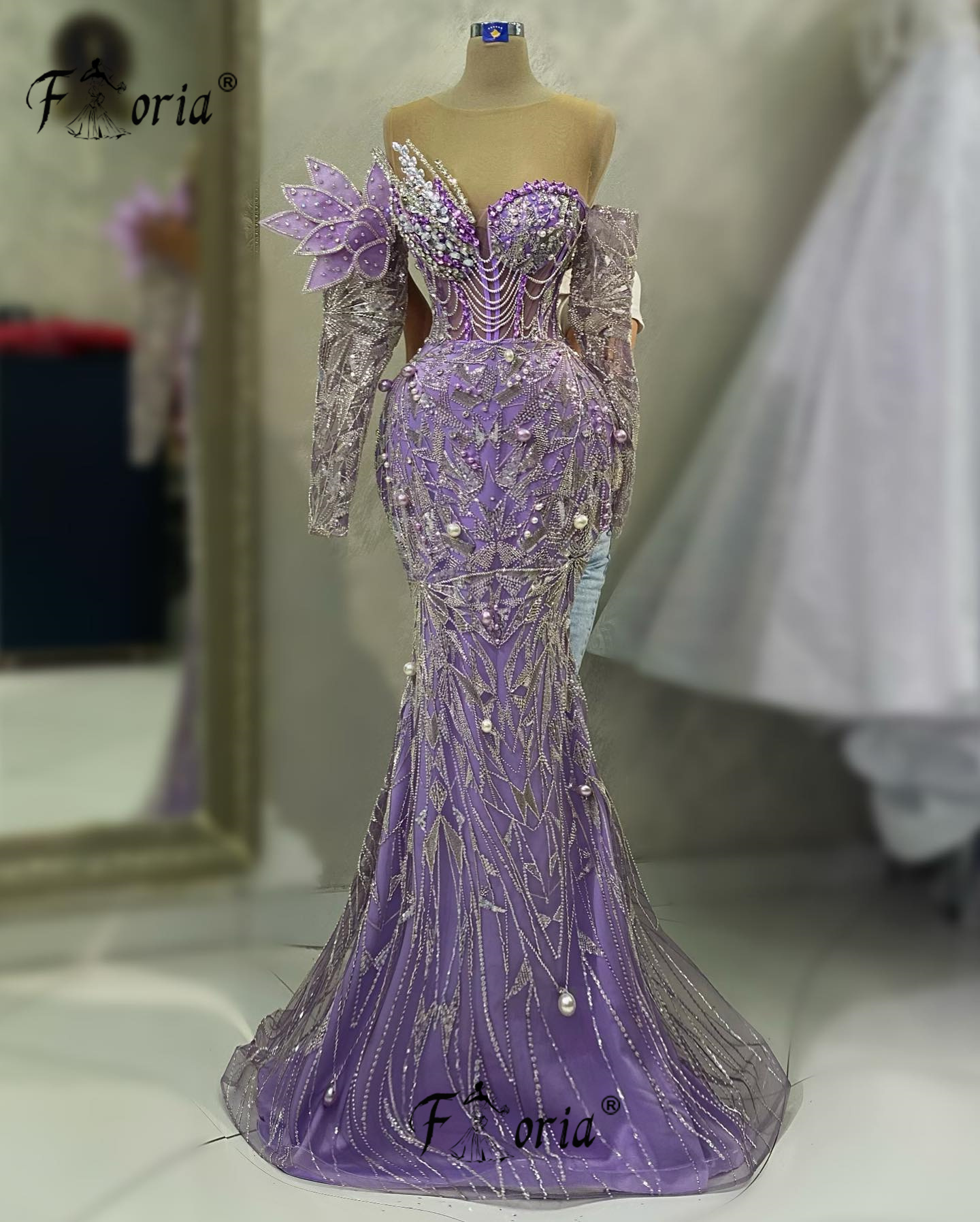 Luxury Crystal Beaded Lilac Mermaid Evening Dress Dubai Long Sleeves Off Shoulder Wedding Gowns Prom Party Dress Robe De Soiree