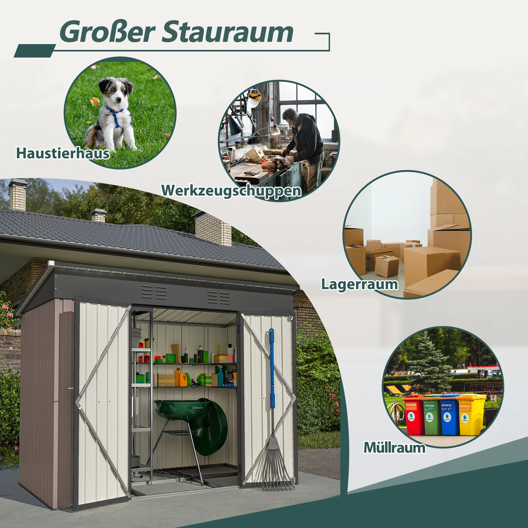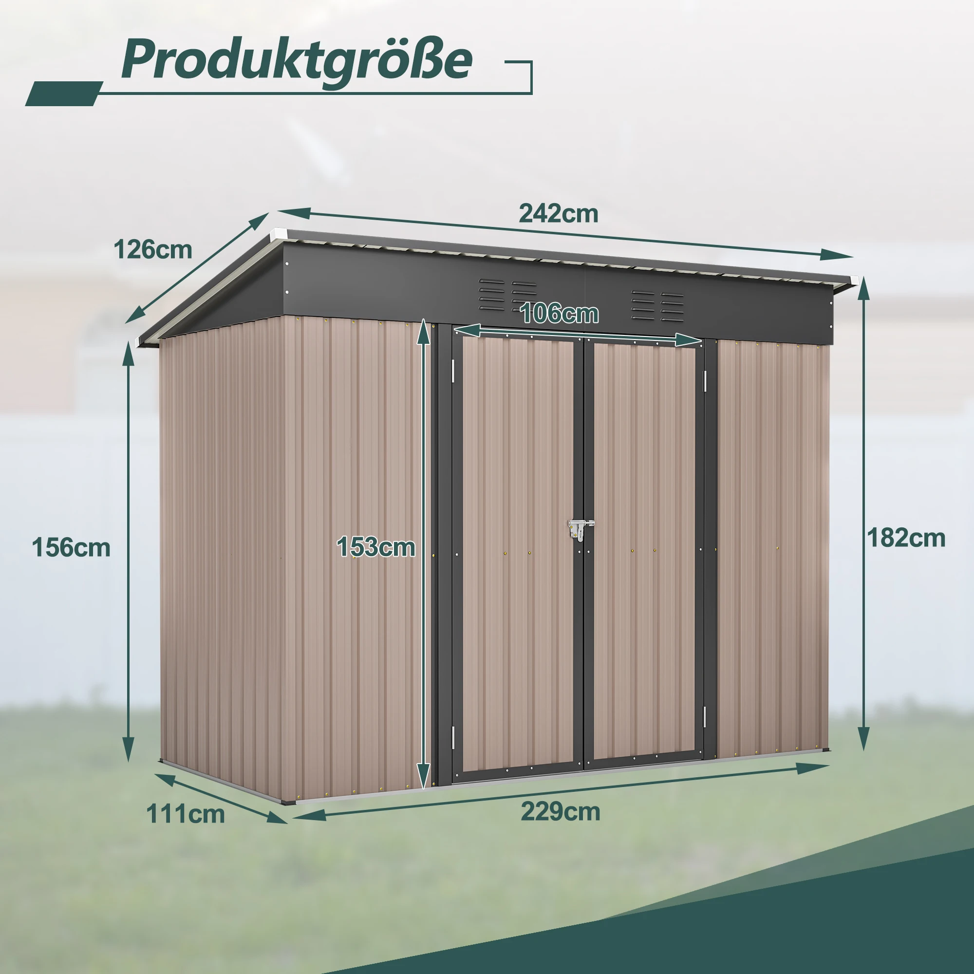 Caseta de Almacenamiento Exterior de 8x4 Pies Caseta de Jardín Metálica Resistente a la Intemperie con Base. Organizador de Herramientas Grande para Patio y Terraza, Color Marrón - TopDealBox
