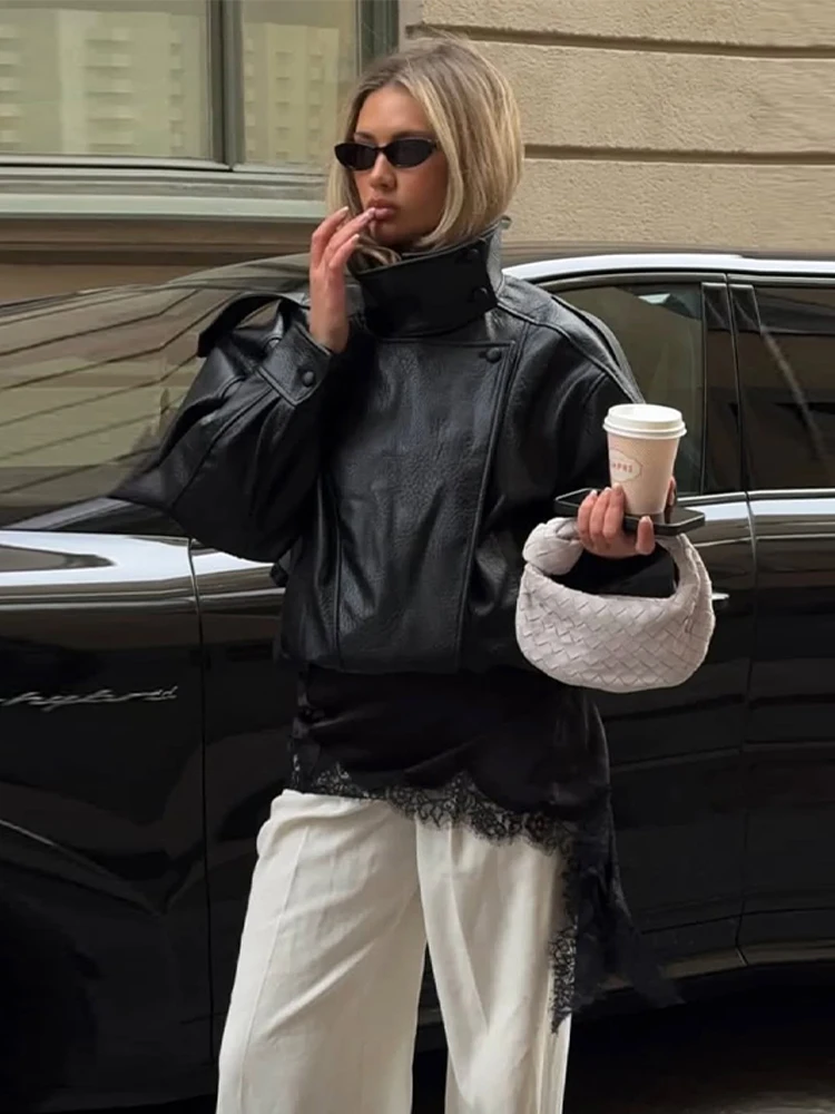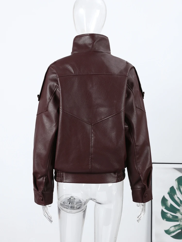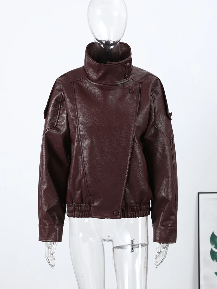 Chaqueta de cuero sintético para mujer, primavera 2026, marrón y negro, manga larga, cuello alto, gruesa, holgada, estilo motociclista, moda urbana - TopDealBox