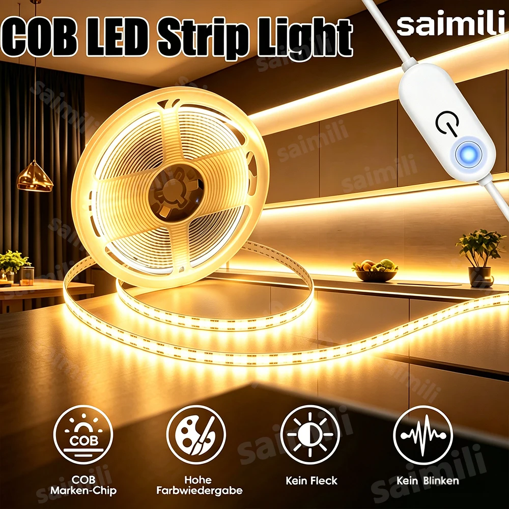 Tira de luz LED COB con USB 5V, interruptor táctil, lámpara flexible regulable, 320 LED/M, cinta flexible para decoración del hogar, habitación, fiesta de Navidad, bricolaje - TopDealBox