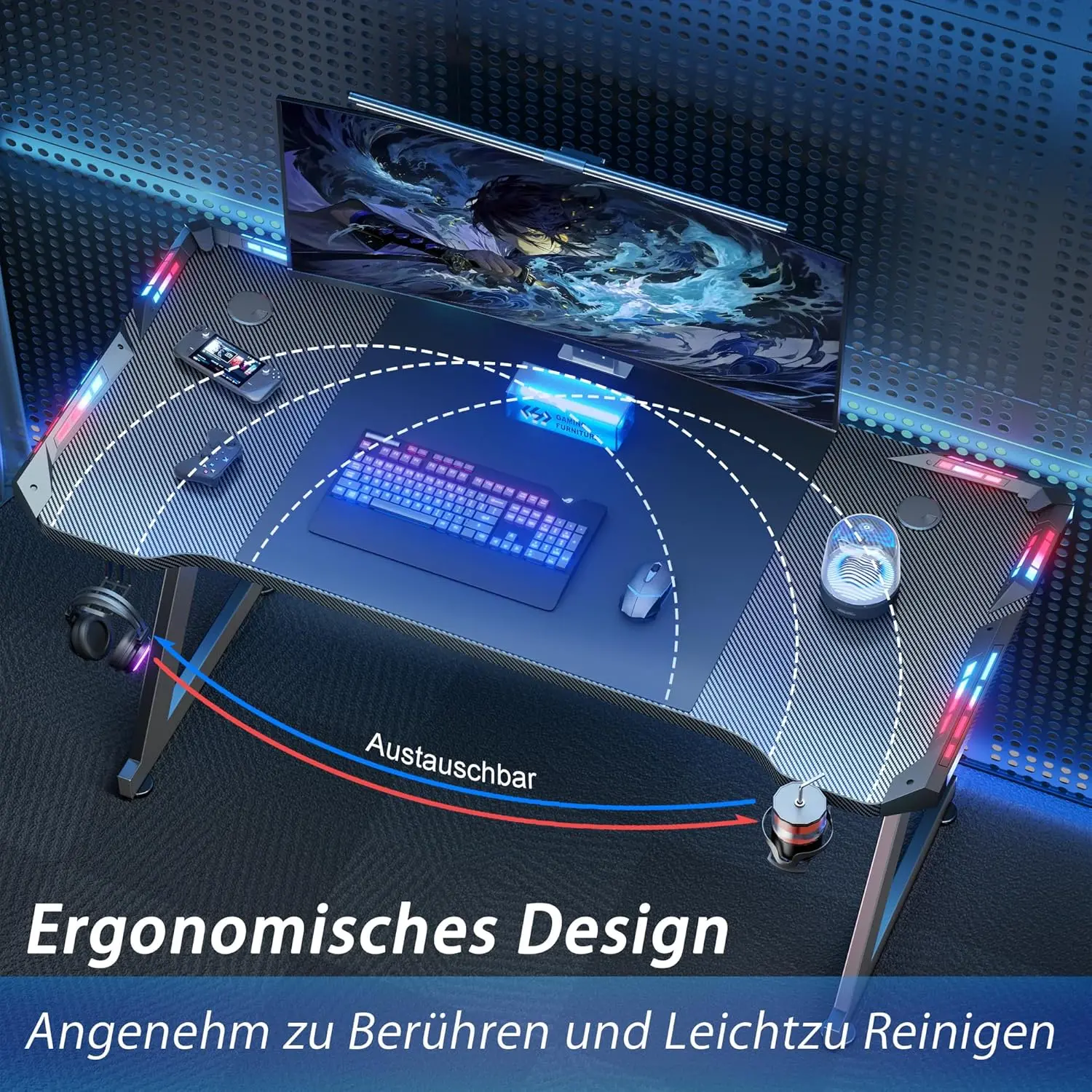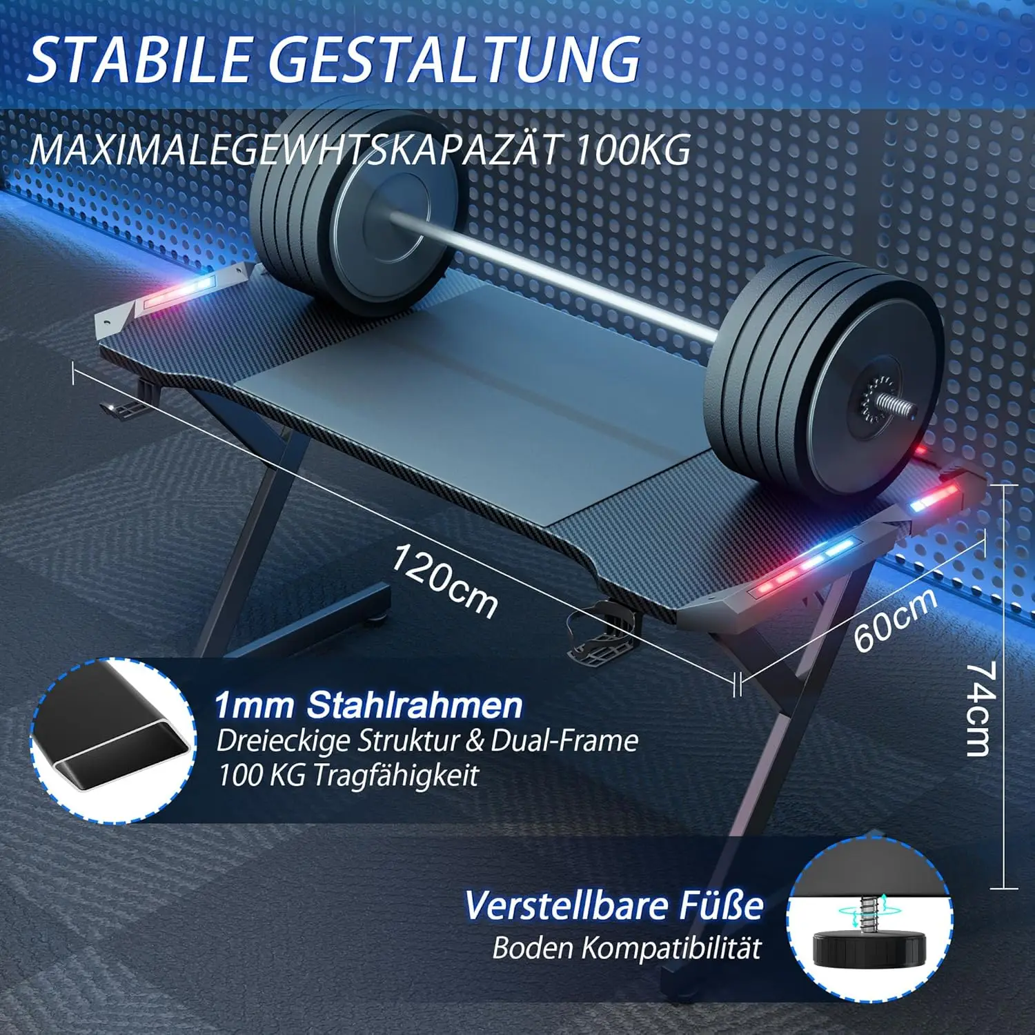 Gaming Schreibtisch 120 x 60 cm, Gaming Tisch mit LED, Estabilizador PC Tisch mit Kohlefaserbeschichtung, Gamer Tisch mit - TopDealBox