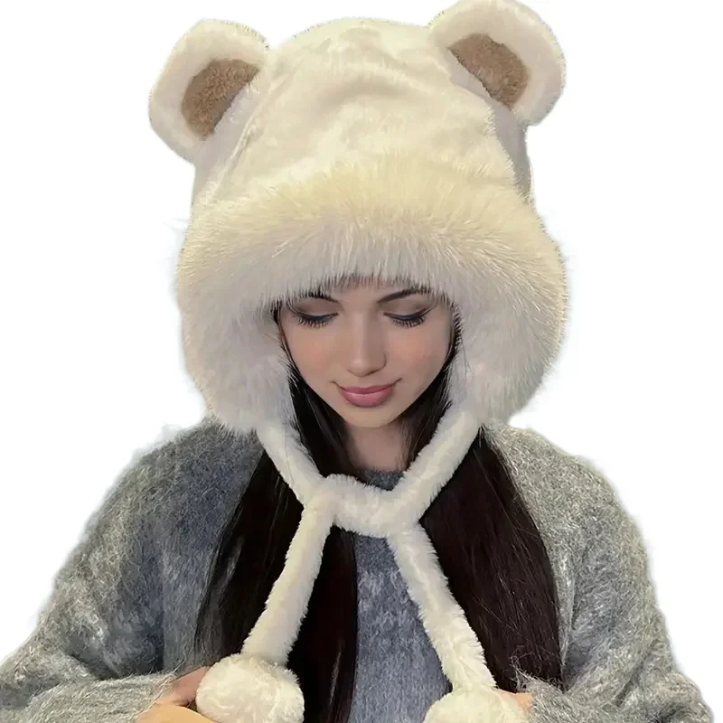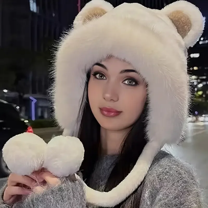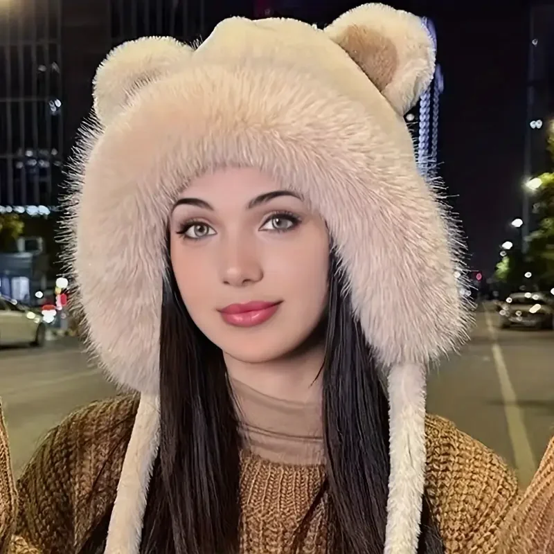 Gorro de oso de peluche para invierno, gorro con protección para los oídos de lana cálida, bonito gorro de ciclismo para mujeres y niñas, traje para Festival de Navidad y Halloween - TopDealBox