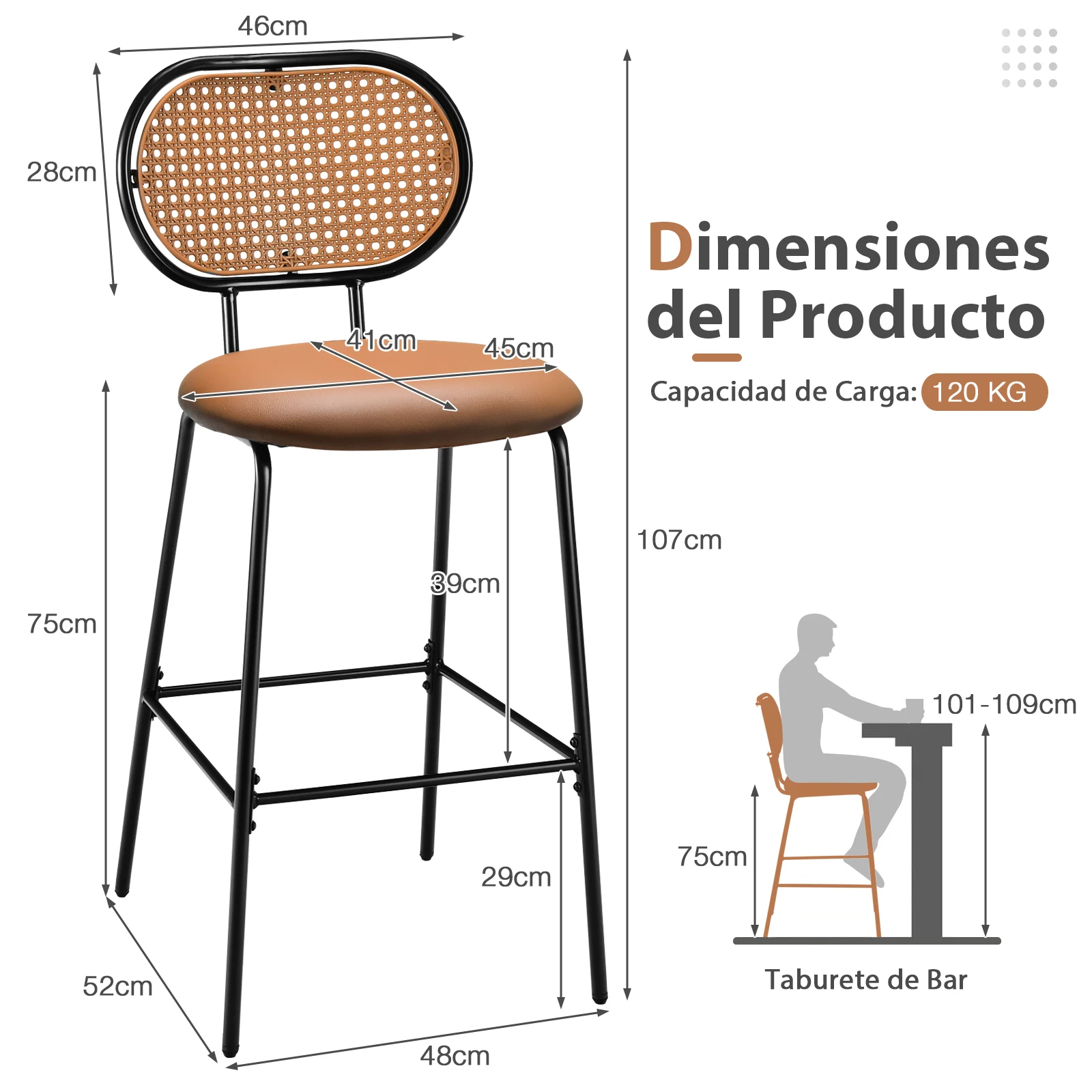 Inicio > Muebles > Muebles de bar Juego de 2 Taburetes De Bar, Sillas de Comedor Modernas de Imitación de Cuero con Respaldo de Ratán, Taburetes de Bar sin Brazos de Altura Ajustable para Bistro Hogar, Restaurante, 75 cm Información de envío