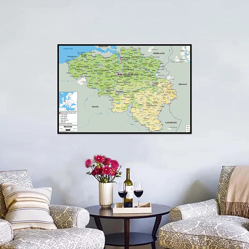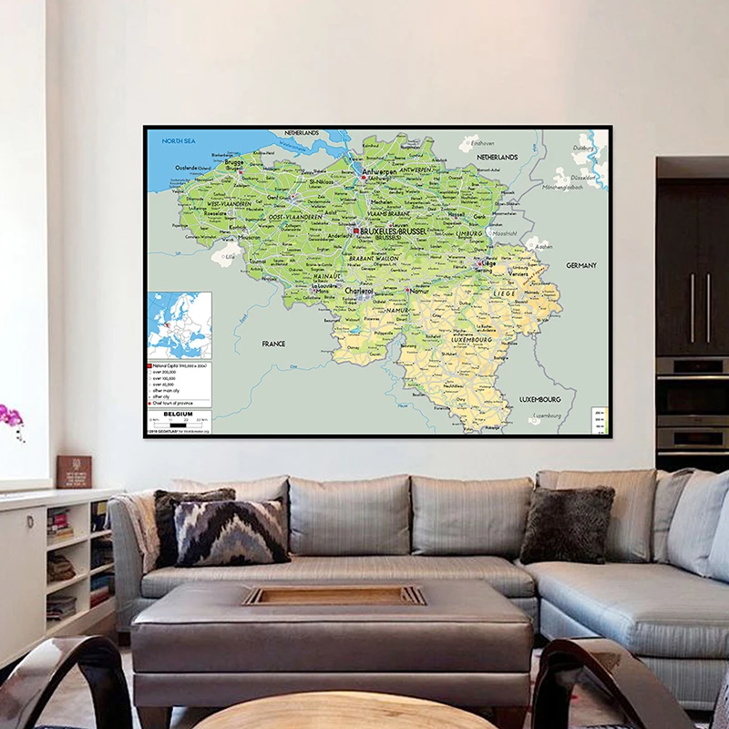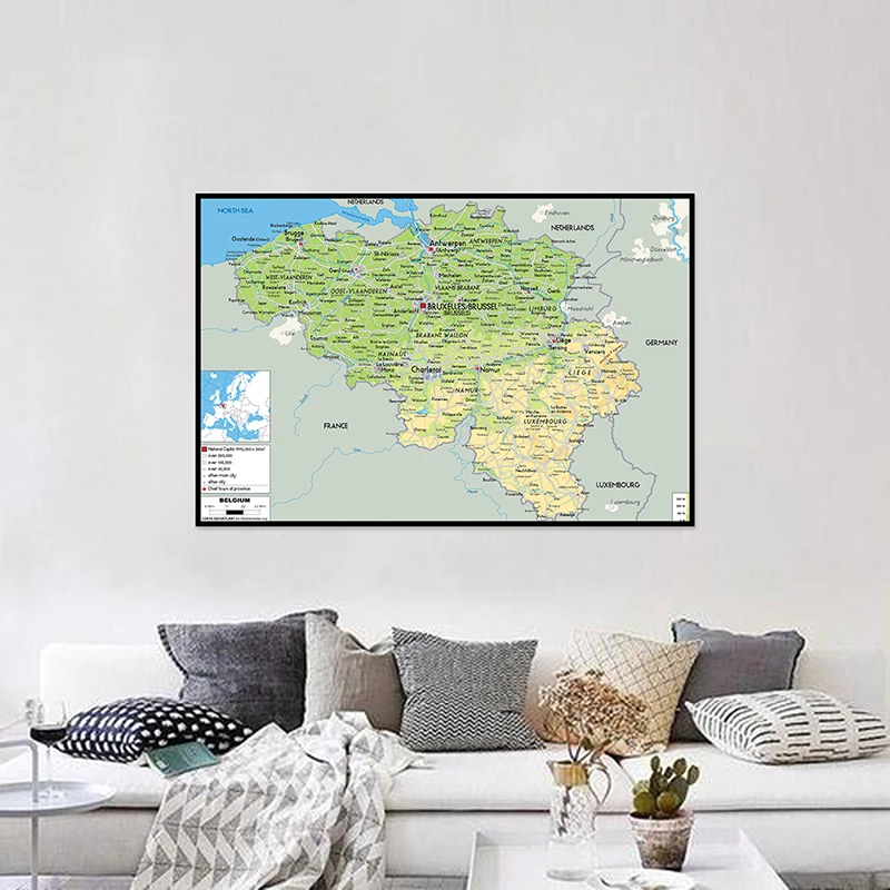 Mapa de Bélgica en inglés, mapa geográfico, arte de pared, póster, pintura, impresiones sin marco, imágenes, decoración del hogar, tapiz de pared - TopDealBox