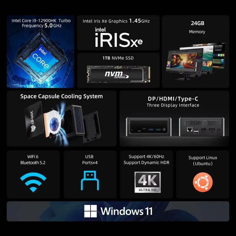 Mini PC BMAX B9 Power con Intel Core i9-12900H, 14 Núcleos, Máx. 5.0GHz, 24GB RAM, 1TB SSD, WiFi 6, Bluetooth, HDMI, USB - TopDealBox