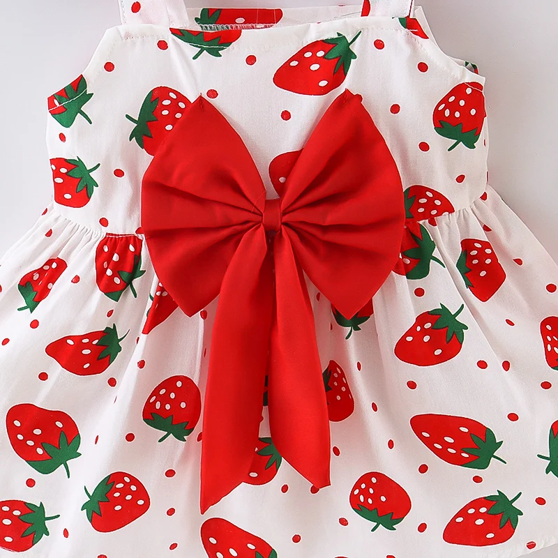 Nuevo vestido de verano para niñas + sombrero, lazo grande, cinta Halter, lunares de fresa, estampado completo, dulce vestido de princesa, equipo de fiesta de cumpleaños - TopDealBox