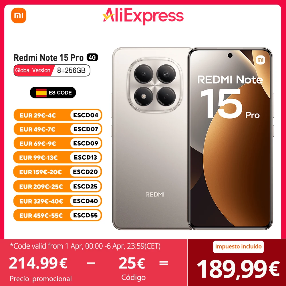♡Vista rápidaXiaomi Redmi Note 15 Pro 4G Versión EU 8GB 256GB MTk Helio G200 Ultra, Pantalla AMOLED 6.77", 120Hz, Cámara 200MP, IP65, NFC249.00 EUREUR 498.00Destacado★★★★★★4.9