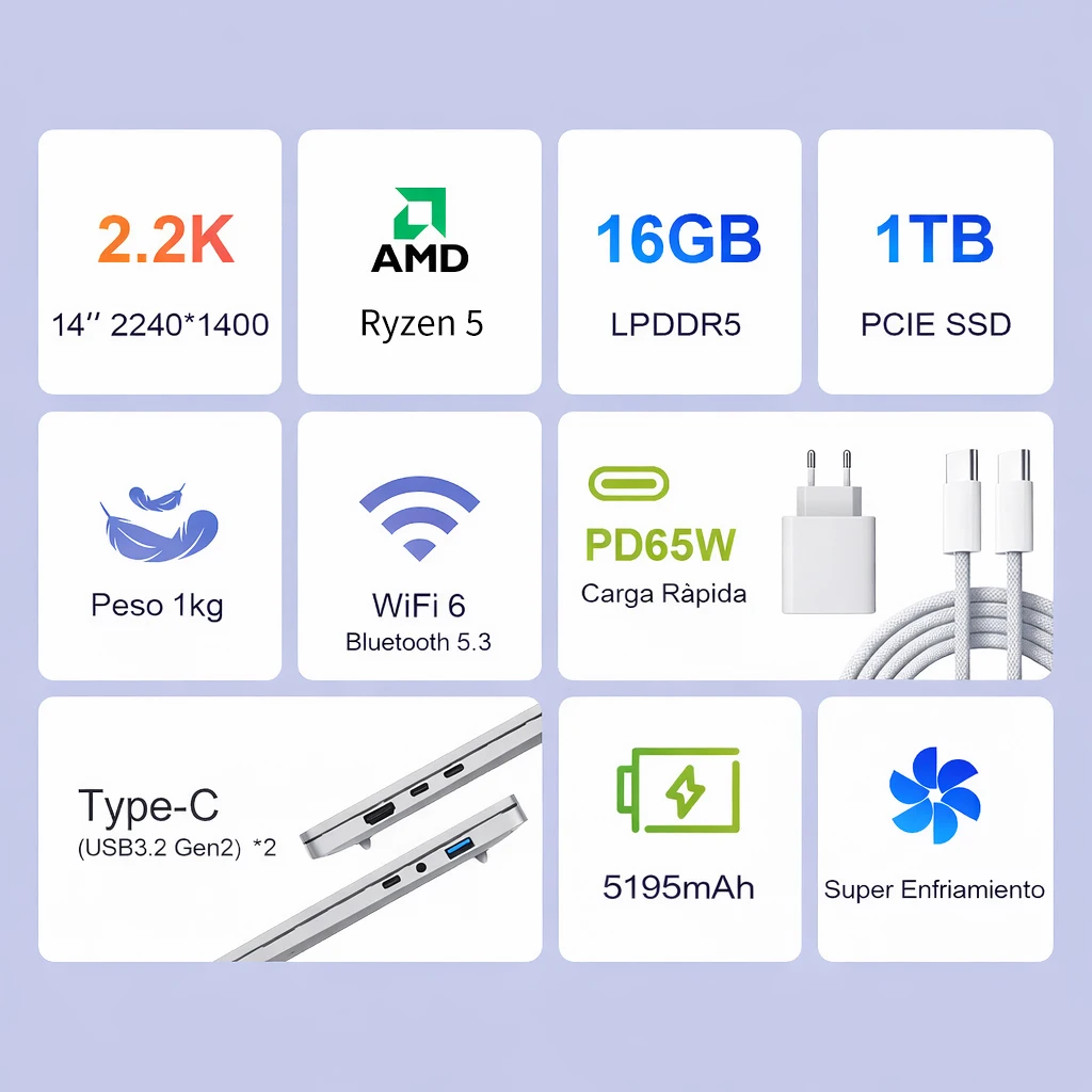Ordenador Portátil Ninkear S14 14 Pulgadas Pantalla 2.2K AMD Ryzen 5 16GB LPDDR5 1TB SSD WiFi 6 Reconocimiento de Huella Digital Notebook Ligero para Oficina Estudiante - TopDealBox