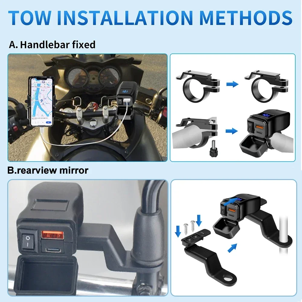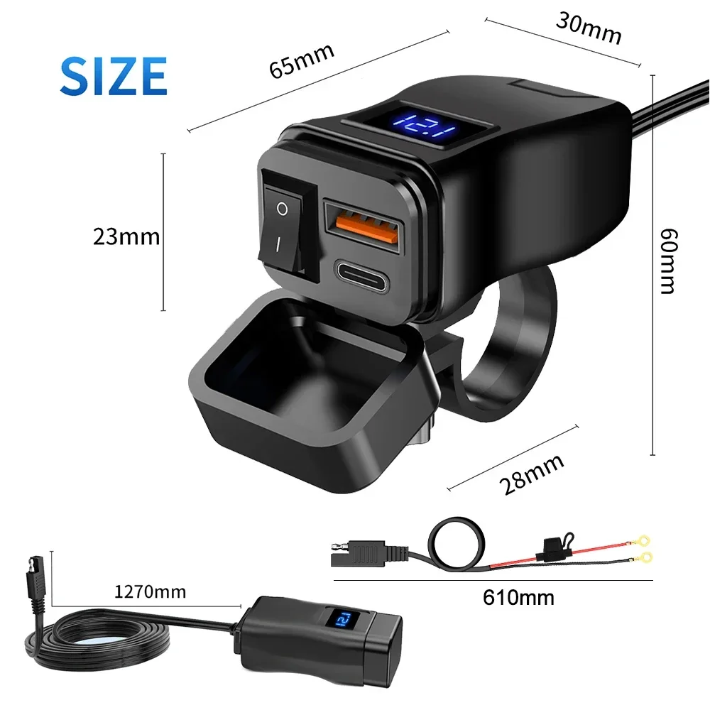 PD QC3.0 cargador celular rápido USB para motocicleta adaptador de fuente de alimentación de 12V conector de enchufe de puerto tipo C con voltímetro de interruptor - TopDealBox