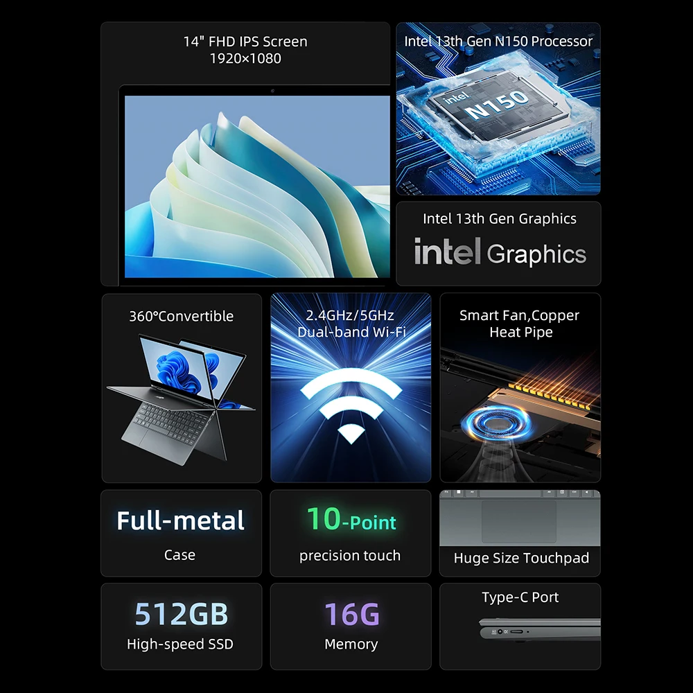 Portátil BMAX Y14 Plus de 14 pulgadas, Notebook con Windows 11, 16 GB de RAM, 512 GB SSD, pantalla LCD IPS de 1920*1080, Intel N150, USB Tipo-C - TopDealBox