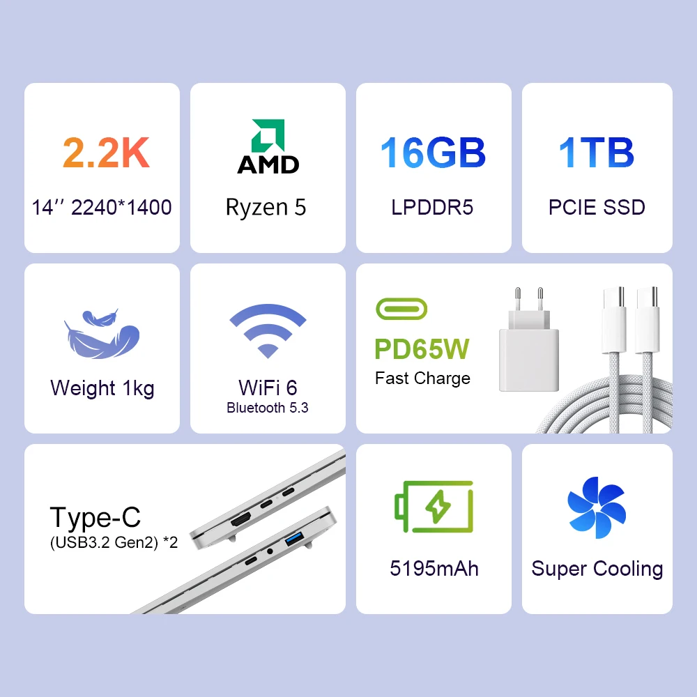 Portátil/Tablet Ninkear S14 con AMD Ryzen ™ Portátil de 5,14 Pulgadas, 16GB LPDDR5, 1TB SSD, Wifi 6, Compatible con Reconocimiento de Huellas Dactilares - TopDealBox