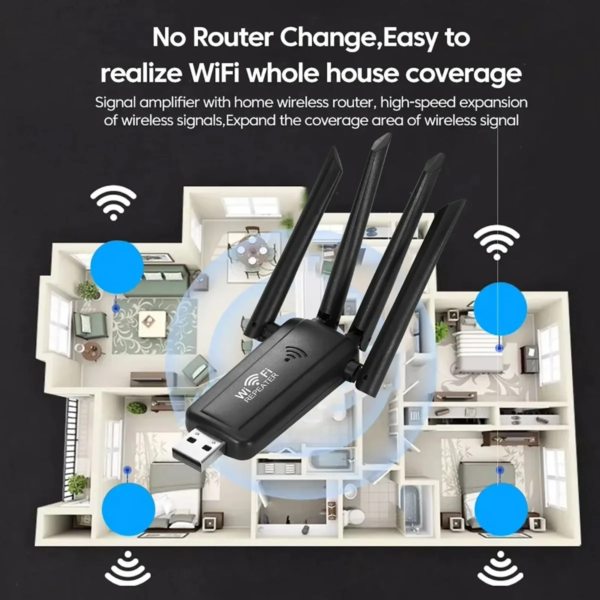 Repetidor WiFi USB inalámbrico de 2,4 GHz, 300Mbps, amplificador de señal WiFi, 4 antenas, enrutador Wi-Fi de largo alcance, red doméstica - TopDealBox
