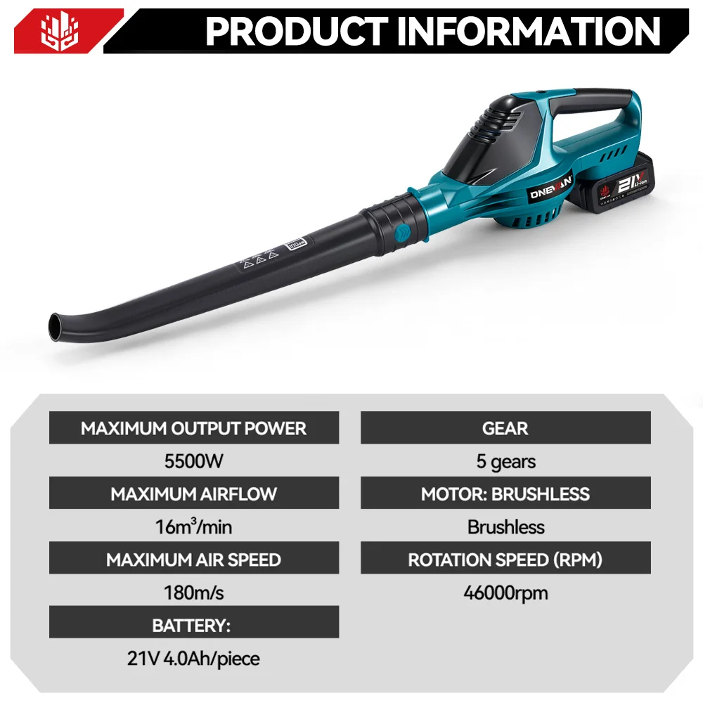 Soplador de aire eléctrico sin escobillas ONEVAN de 5500W, inalámbrico, para soplar polvo y hojas, herramienta de limpieza de jardín de alta potencia, compatible con baterías Makita. - TopDealBox
