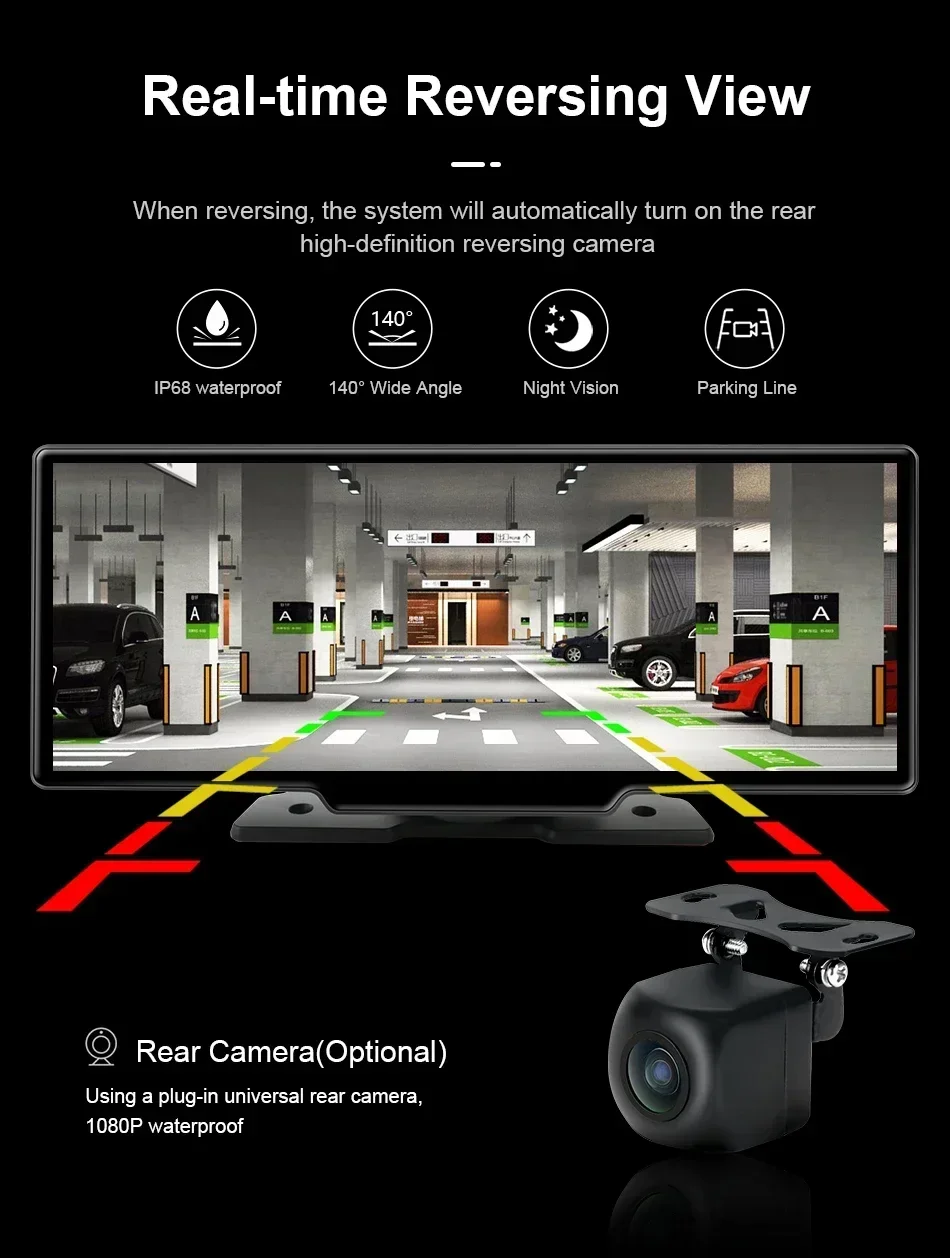 Srnubi 10,26 "cámara de salpicadero retrovisor Carplay Android Auto 4K DVR reproductor de navegación GPS grabadora de doble lente tablero 24H Park WIFI BT - TopDealBox