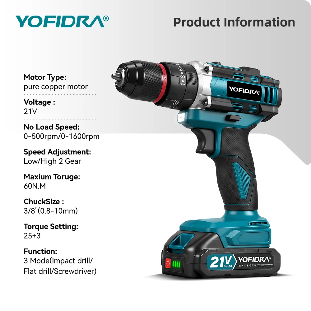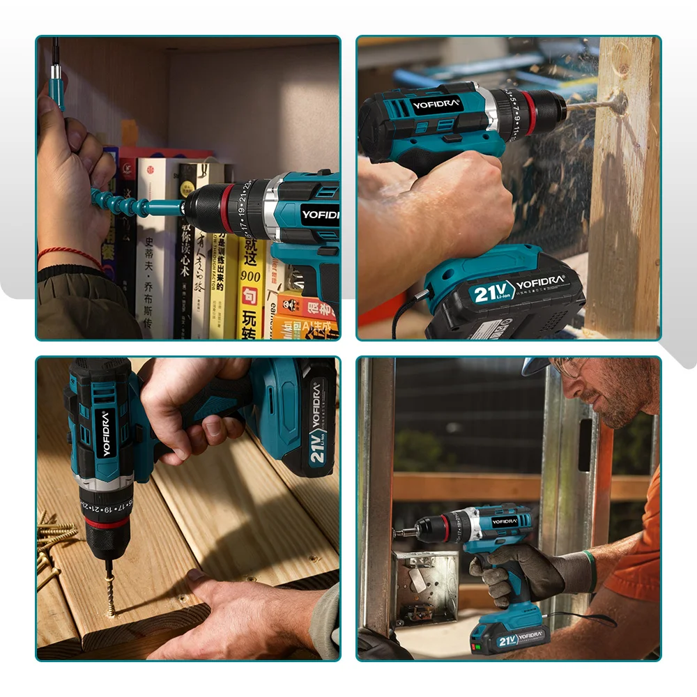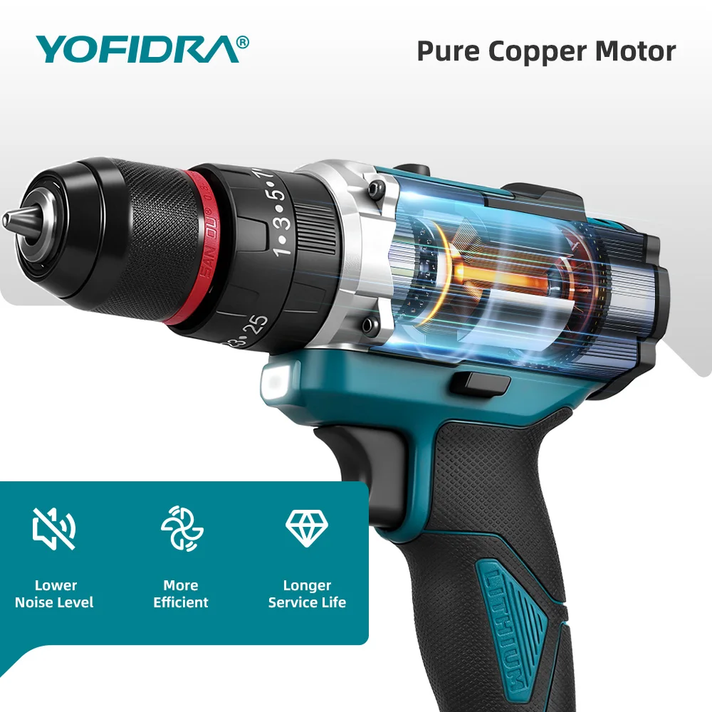 Taladro percutor eléctrico YOFIDRA 25+3 de torque, inalámbrico, 3 en 1, herramienta eléctrica para trabajar la madera, compatible con batería Makita de 21V. - TopDealBox