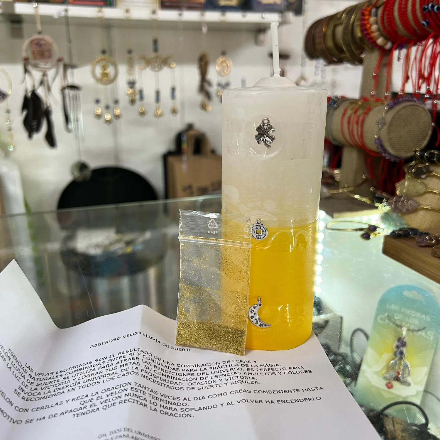 THE BUBBLE SHOP - Velón de Lluvia de Suerte para Suerte Divina y Juegos de Azar Poderoso Velón Ritualizado para Atracción de Suerte, Fortuna y Dinero Vela Amarilla y Blanca con Amuletos de Trébol, Moneda China y Luna, Polvos Dorados y Oración. - TopDealBox