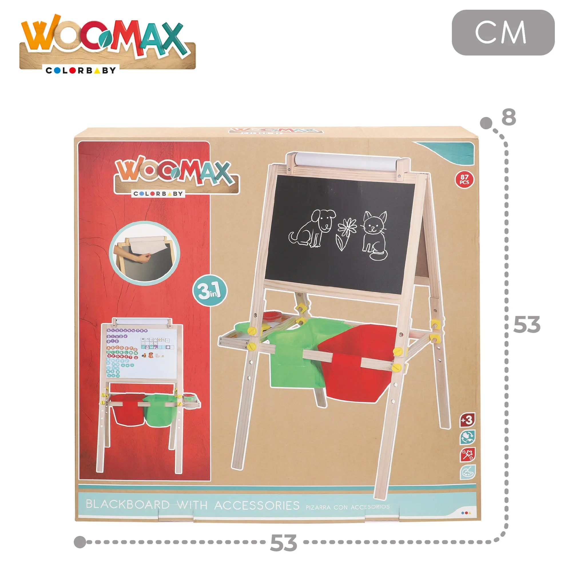 WOOMAX - Pizarra infantil doble cara (negra y blanca magnética) + rollo de papel para escribir, 57x59x93 cm, incluye tizas, imanes educativos, borrador, rotulador, 2 cestas de almacenaje y 2 botes, caballete madera, diseño 3 en 1, juguetes niños 3 años - TopDealBox